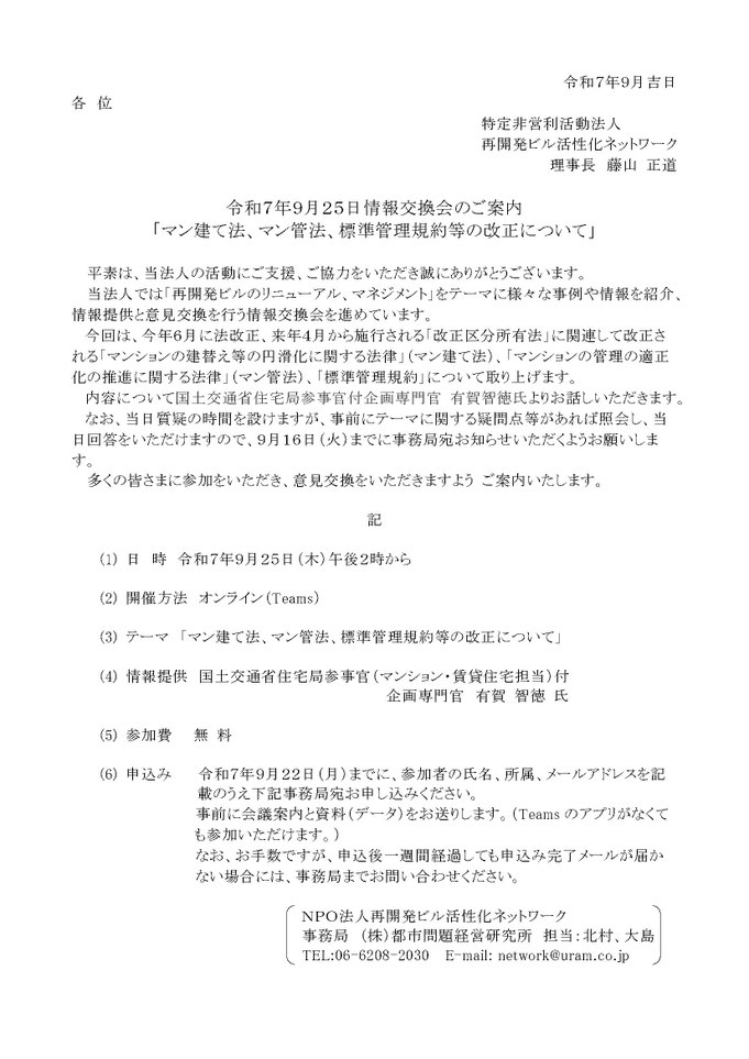 当法人では「再開発ビルのリニューアル、マネジメント」をテーマに様々な事例や情報の紹介、情報提供と意見交換を行う情報交換会を進めています。